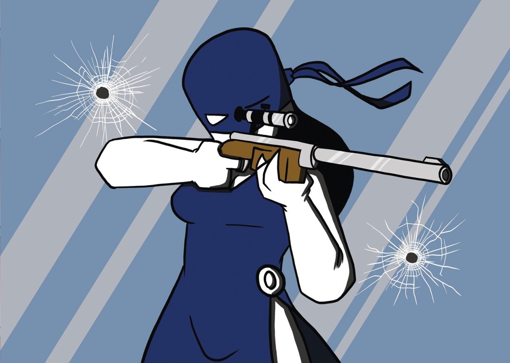 Raised as a child soldier in Eastern European warzones, Deadeye is a cold-blooded mercenary known by the public as a member of the Villain Underground. Disappearing after the destruction of Lapis Harbor, Deadeye has recently been seen in the company of her estranged sisters Recoil and THWIP!